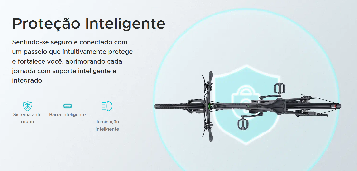 Observações Os valores de peso podem variar em 3–5%. A autonomia real depende do modo de uso, terreno e condições climáticas. Projetada para deslocamento urbano e trilhas leves, com baixa manutenção. Ideal para quem busca: ? Mobilidade ágil e sustentável ? Conforto e segurança em subidas ? Tecnologia integrada (motor, sensores e iluminação solar)