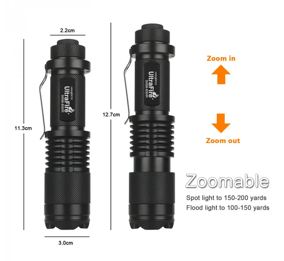 Iluminação brilhante: O LED UltraFire fornece fortes 800 lúmens, ideal para iluminar grandes áreas ou localizar objetos a até 95 metros de distância. Foco com zoom: ajuste facilmente o feixe para atender às suas necessidades, quer você precise de um holofote focado ou de um holofote amplo. Design durável: Feitas com liga de alumínio resistente, essas lanternas são construídas para suportar condições externas, tornando-as perfeitas para acampamento, caminhadas ou emergências. Compactas e portáteis: pequenas o suficiente para carregar no bolso, essas lanternas são convenientes para uso em trânsito.