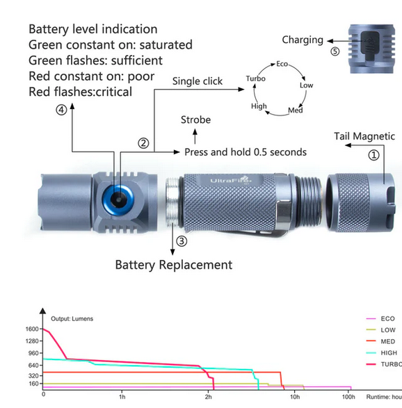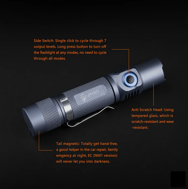 UltraFire EC1 tem 7 níveis de brilho distribuídos uniformemente, alguns recursos principais da lanterna UltraFire são: Segurança, brilho, durabilidade e conveniência. Esta luz ideal pode lidar com qualquer ambiente difícil desde segurança e ou em caso de emergência.