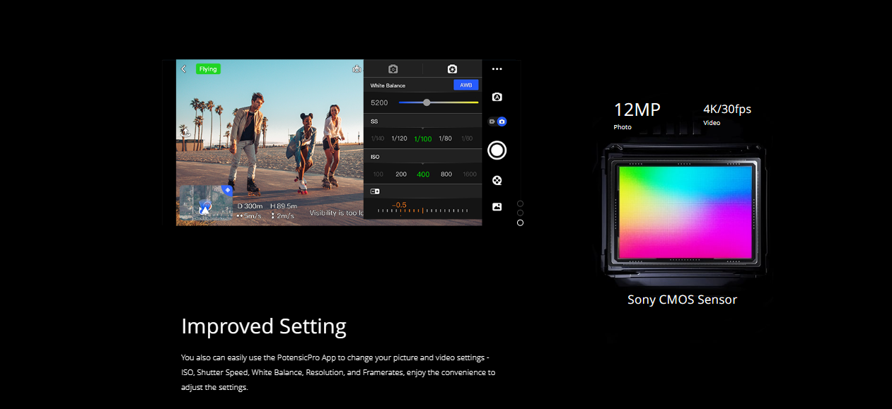 Configuração de câmara aprimorada - Drone GPS ATOM 4K com gimbal 3 eixos: ISO ajustável, velocidade do obturador, equilíbrio de branco, resolução e taxas de quadros