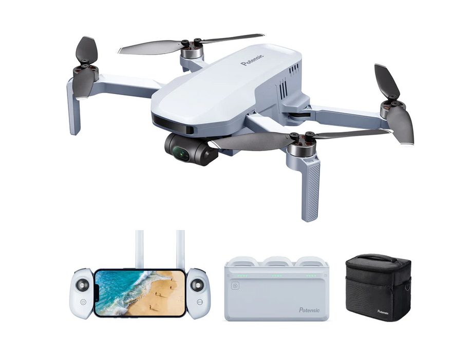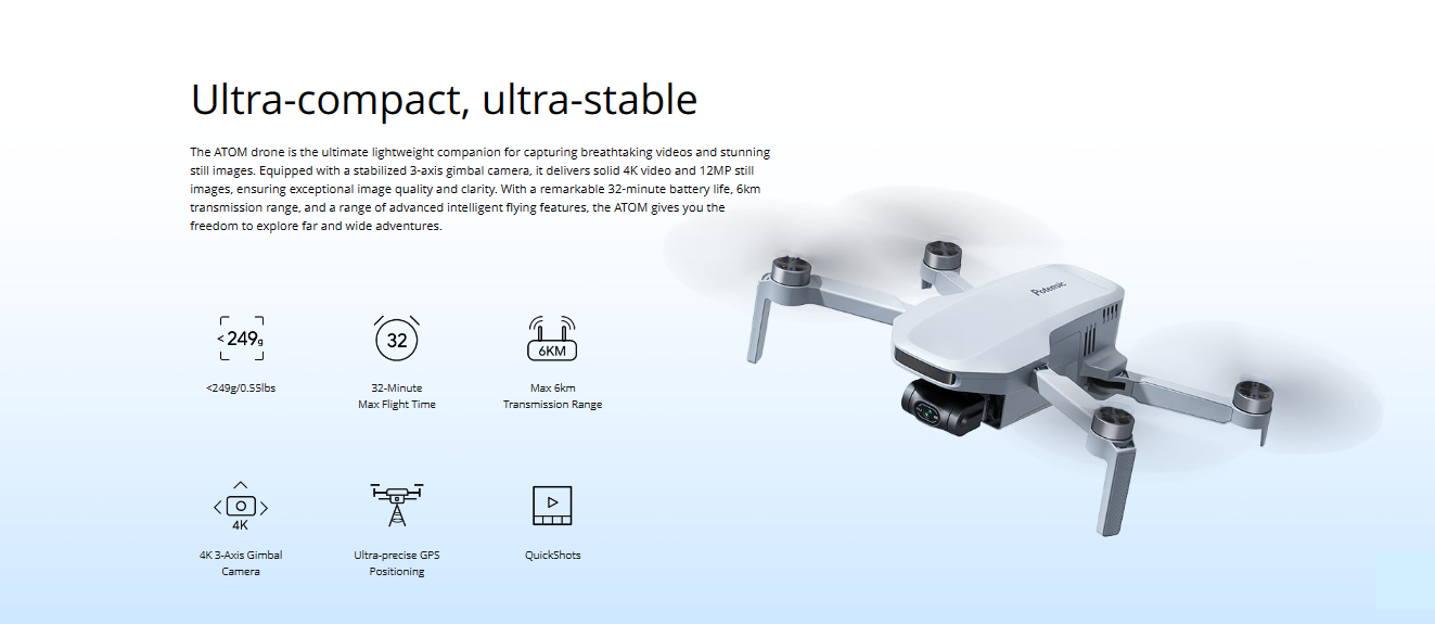 Imagens de alta qualidade com o Drone GPS ATOM 4K com gimbal 3 eixos: um gimbal de 3 eixos sem escovas e um sensor Sony CMOS que pode gravar vídeos 4K/30fps e fotos de 12MP, oferece uma faixa de inclinação de +20° a -90°. Fotos perfeitamente niveladas, não importa o quanto você incline.