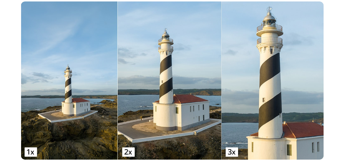 Zoom digital: A distância não é problema, aproxime tudo com o zoom digital. Possui opções para 1x, 2x e 3x, permitindo enquadramento rápido e fácil de cenários a longo alcance.