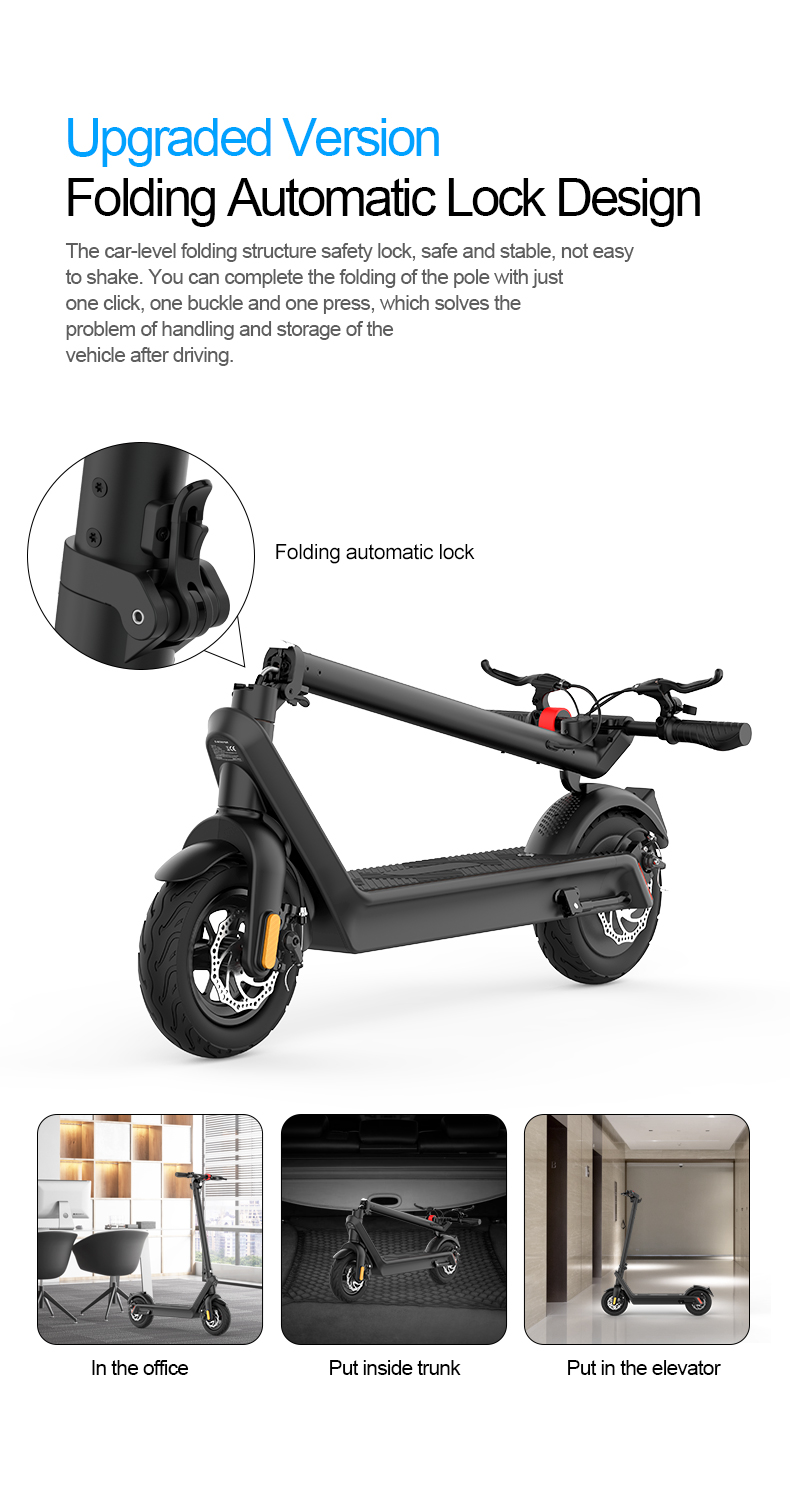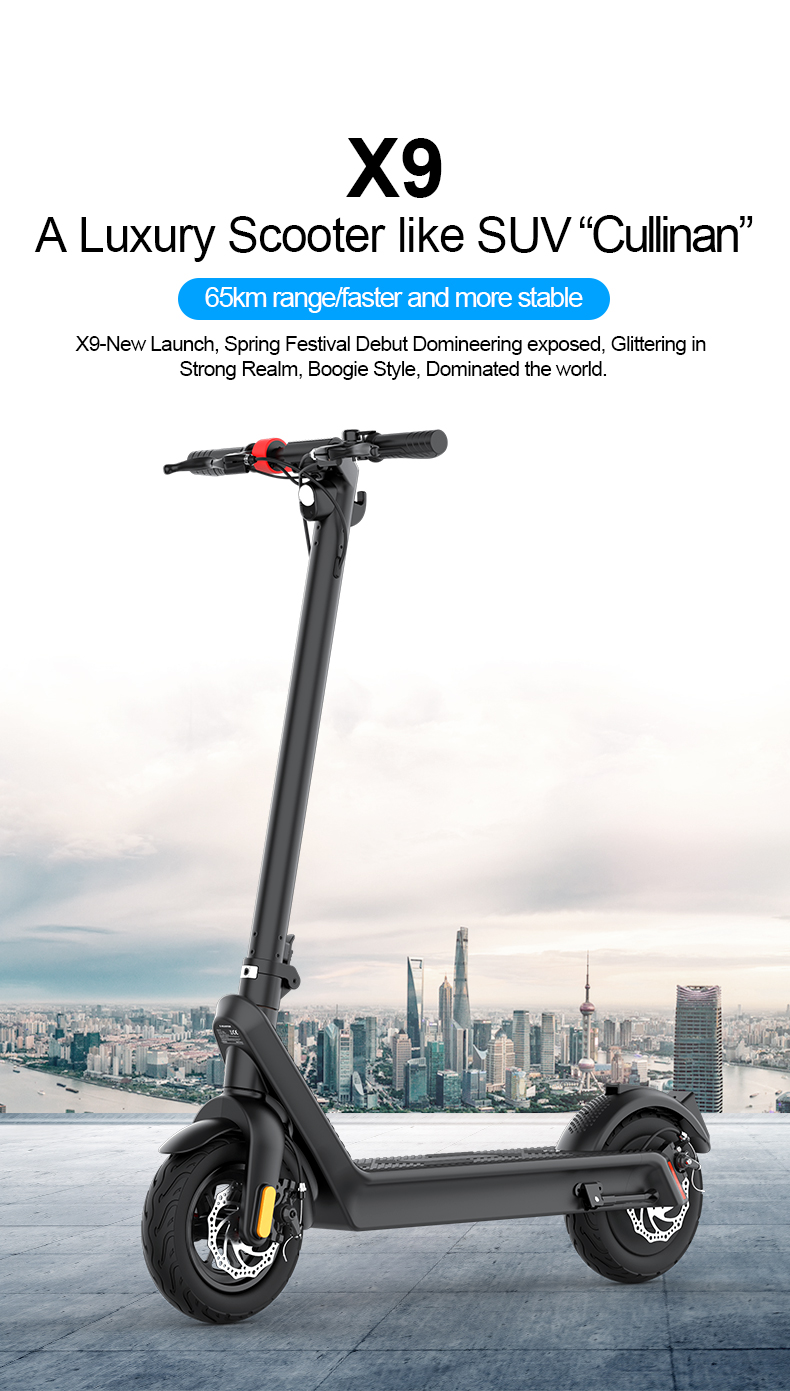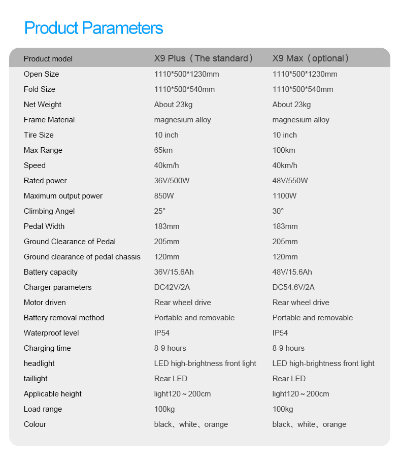 Modelo: X9 Plus Tamanho aberto: 1110*500*1230mm 1110*500*1230mm Tamanho da dobrado: 1110*500*540mm 1110*500*540mm Peso líquido: 23kg Material da estrutura: Liga de magnésio Tamanho do pneu: 10 polegadas Alcance máximo: X9 Plus 65 km / X9 Pro Max 100Kms Velocidade: 40 km/h Potência nominal: X9 Plus 36V 500W / X9 Pro Max 48V 550W Potência máxima de saída: X9 Plus 850W / X9 Pro Max 1100W Angulo máximo de subida: X9 Plus 25° / X9 Pro Max 30° Largura do pedal: 183mm Distância ao solo do pedal: 205mm Distância ao solo do chassi: 120mm Capacidade da bateria: 36V/15,6Ah Parâmetros do carregador: DC42V 2A / X9 Pro Max DC54.6V 2A Motorização: Tração traseira Método de remoção da bateria: Portátil e removível Nível de proteção à água IP54 Tempo de carregamento: 8 a 9 horas Farol dianteiro: LED de alto brilho Luz Traseira: Led Altura aplicável: 120~200cm Carga máx: 100kg Cor: preto